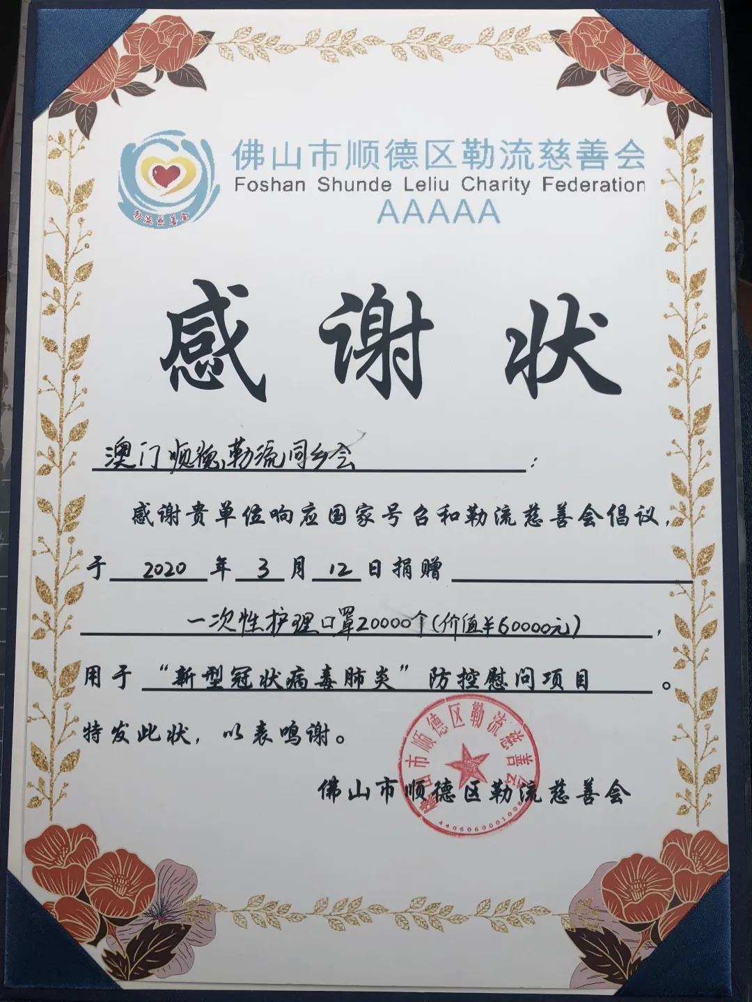 勒流慈善会向澳门顺德勒流同乡会颁发感谢状,对他们在全民战“疫”中的责任与担当给予了肯定。感谢他们积极响应国家号召和勒流慈善会倡议,用实际行动支持勒流的疫情防控工作。充分展示了勒流儿女立足澳门、眷顾家乡,守望相助的家国情怀。